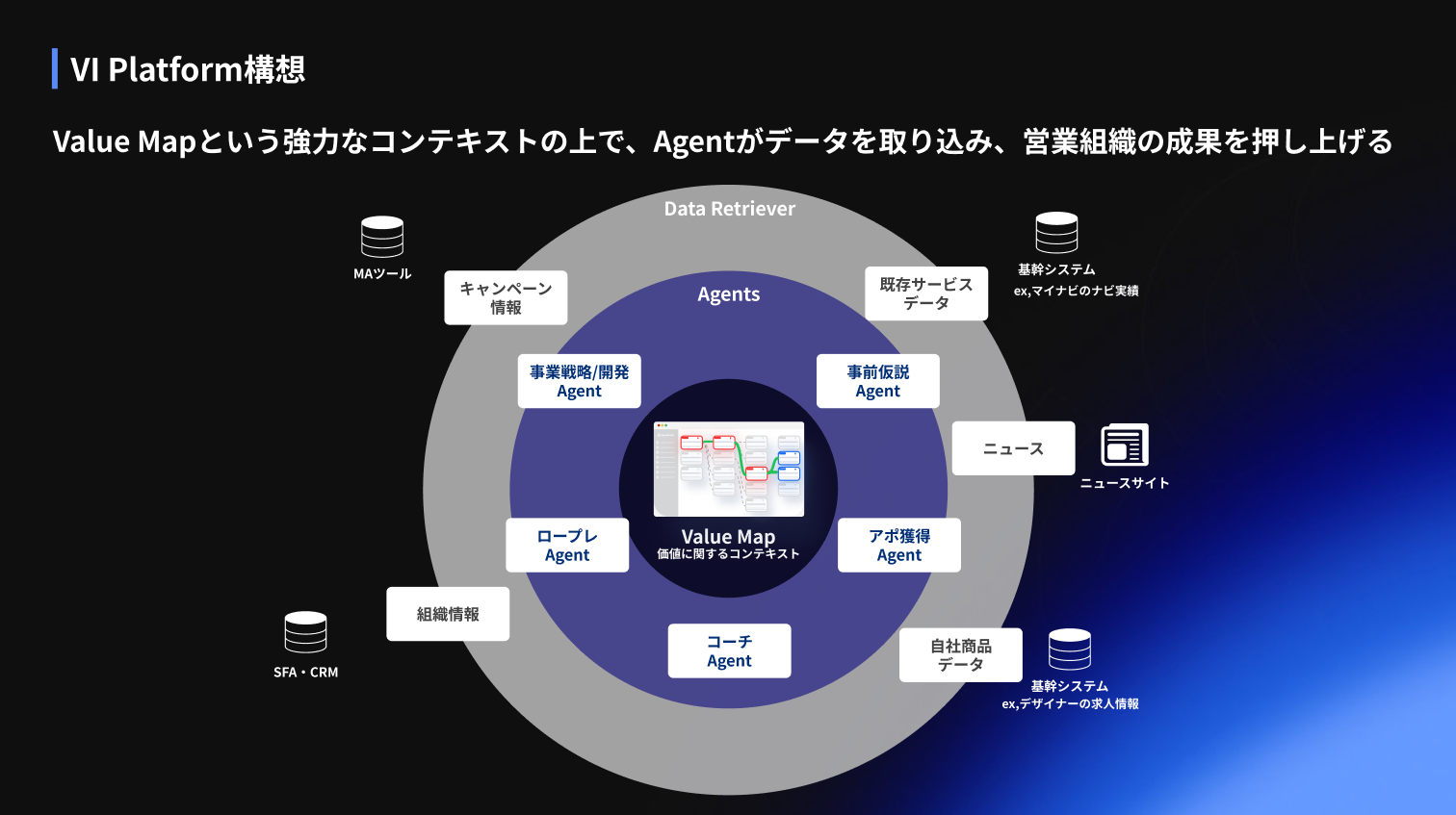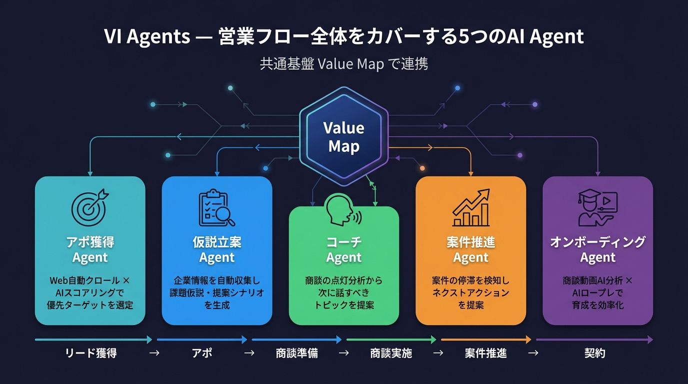 VIは商談分析にとどまらず、営業フロー全体をカバーする5つのAI Agentを展開していきます。すべてのAgentが共通基盤「Value Map」で連携し、一貫したコンテキストで動作します。