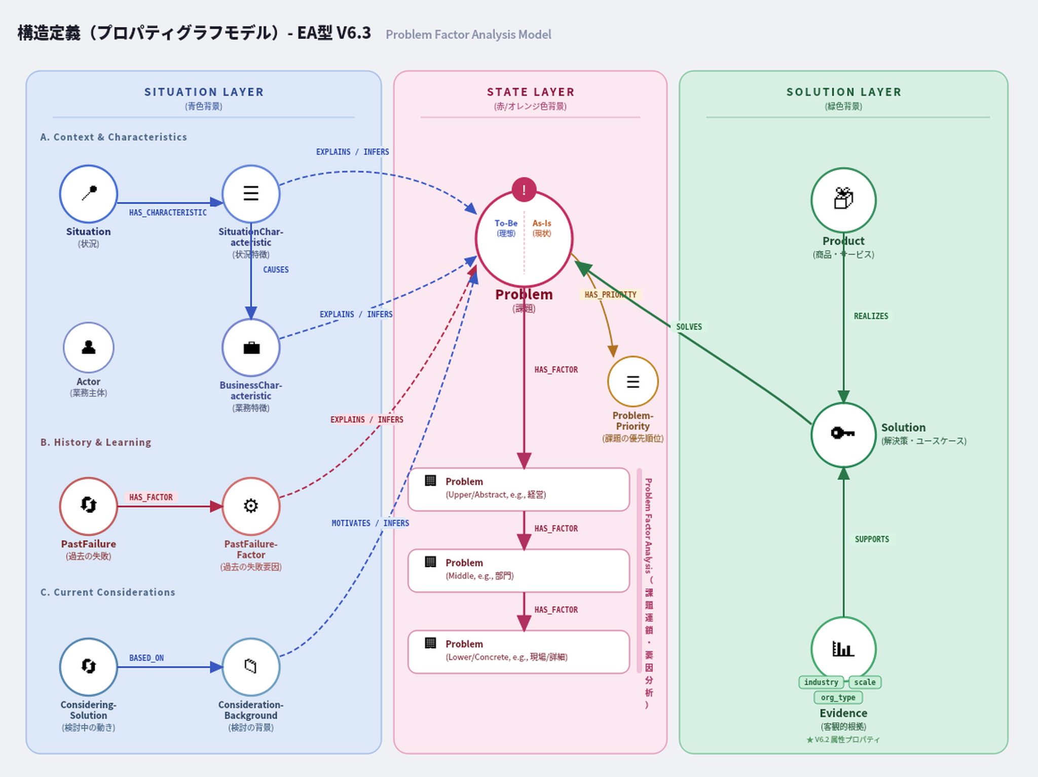 Value MapはProperty Graph(プロパティグラフ)モデルで設計されています。設計思想はProblem-Centric Design(PFA型: Problem Factor Analysis Model)。すべてのデータが「課題(Problem)」を中心に構造化されます。