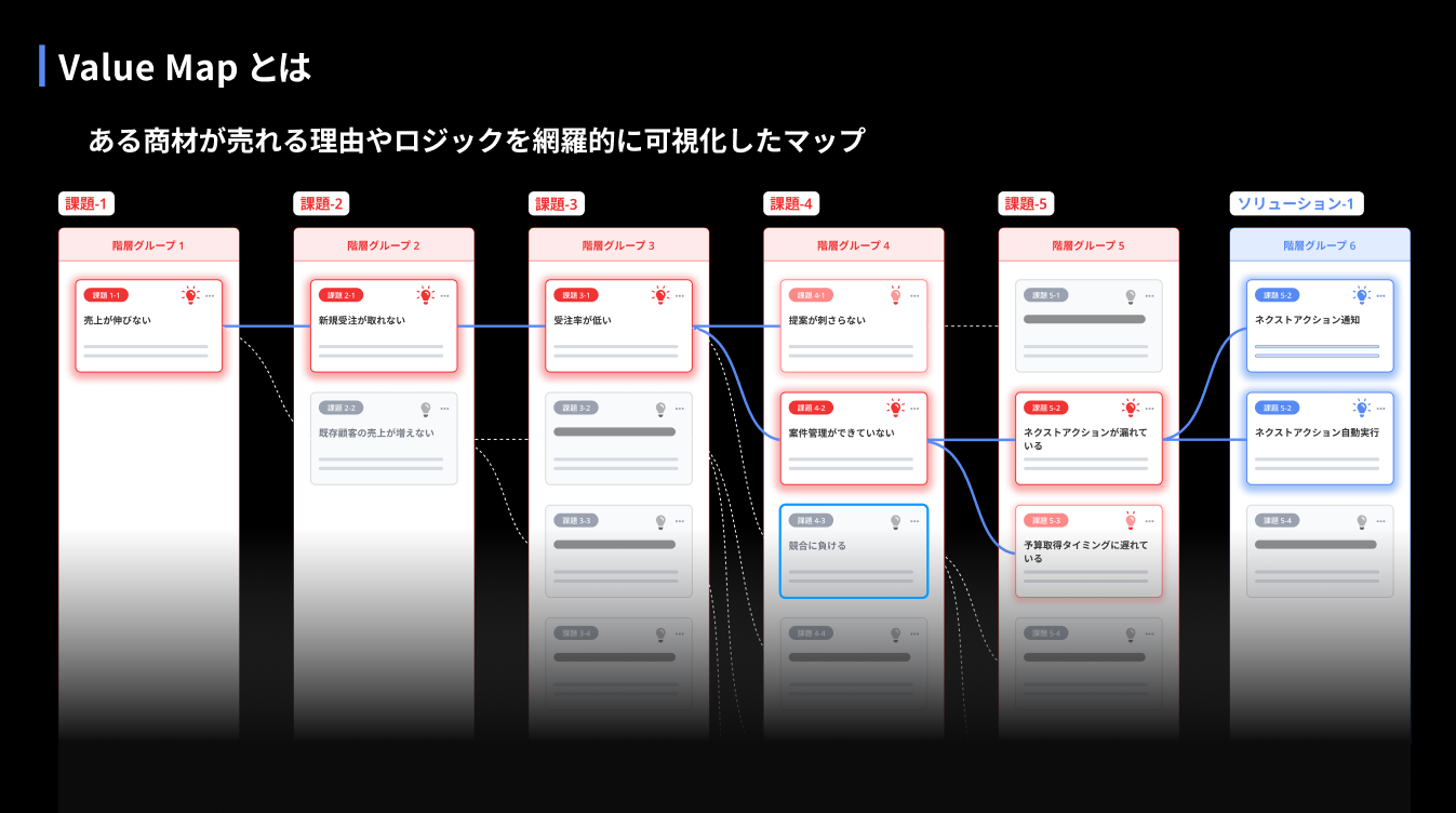 コンサルタントが顧客の営業現場に入り込み、商談録画50〜100本を分析。そこから得た一次情報を構造化したものが「Value Map」です。